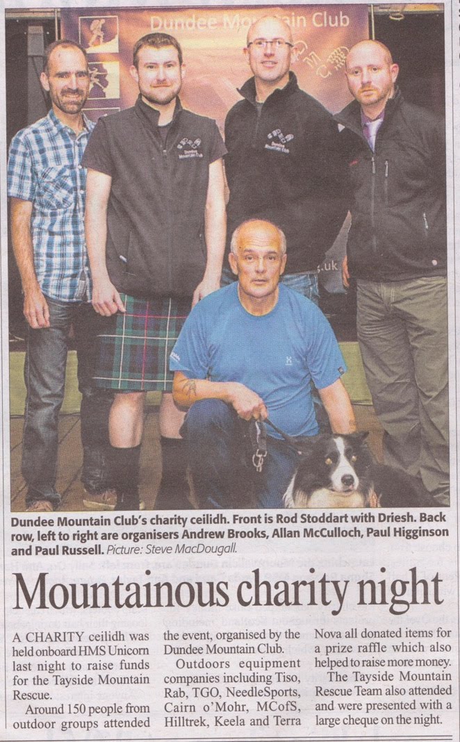 Raffle prizes kindly donated by companies and individuals including Tiso, Rab, TGO, NeedleSports, William Chrystal, Cairn o’Mohr, MCofS, Hilltrek, Keela and Terra Nova.