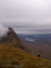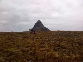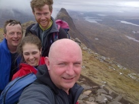 A wee slog up to the next summit and I found I had mobile phone reception so I sent a quick text home to say the difficulties were over. This proved a bit premature as we found another tricky downclimb to negotiate. Katie skipped down this whilst the older and wiser members of the group gibbered at the top. After a bit of nervous scrambling we were back on route to the bealach. Here Katie impressed us with her splits over the gap in the improbably situated stone dyke up there. Not long after we were up at the summit of Caisteal Liath by 1pm. Suilven conquered.