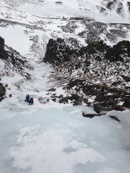 Despite the threat of high winds, Allan, Dave, Ephraim, and Ewan headed to the Cairngorms for some winter climbing at Lurcher’s Crag. We weren’t sure what to expect, but recent trip reports suggested that some good ice had formed in the gullies. There were a few inches of fresh snow on the ground as we plodded toward Chalamain gap. After traversing across a steep slope that guarded the entrance to the gap, we picked our way through the rocks while trying to avoid stepping into the deep, snow-covered gaps hiding between them. We faced increasing winds when we exited the gap, but shortly we found our way to the crag and discovered that the winds there were fairly low and the ice looked great. Dave and Ephraim roped up for the first nice-looking route (Right-Hand Ice Fall) while Ewan and Allan headed a bit farther to tackle North Gully. There was quality ice on both routes. Dave took on the first pitch of the Right-Hand Ice Fall, placing a few ice screws and making his way up the series of steps lining the gully. A light layer of snow covered the slopes that were interspersed between steeper pitches, giving us a break from the ice and saving us from running out of screws. After swapping leads for the second pitch and again for the third, we reached the snow slopes above the gully and took a well earned rest. The trek back to Chalamain gap was quick, with soft snow cushioning our tired knees and even giving us the opportunity for some unexpected glissading. Meanwhile, Ewan and Allan made their way up the slightly steeper ice of North Gully. The longer route had little snow on it, and after five pitches of nearly continuous ice the team exited onto the ridge in the late afternoon. With the help of head torches, Ewan and Allan made it back to the car shortly after dark. We capped off the night with a meal at the chippy in Aviemore and then headed back to Dundee, already thinking about our next outing.
