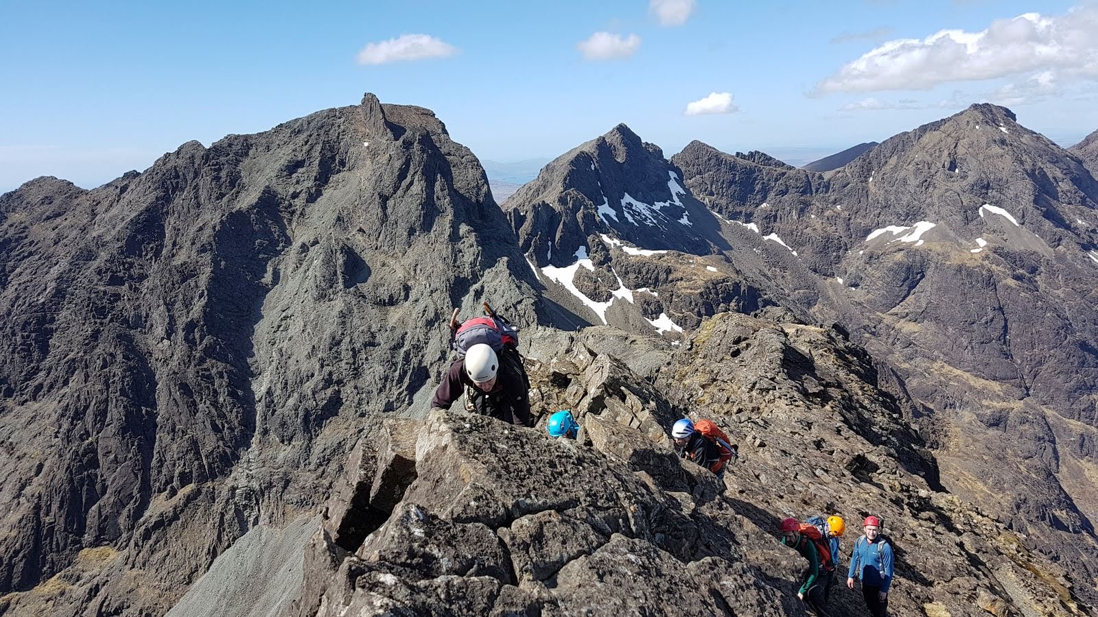 Since we were on the ridge, it seemed rude not to bag another couple Munros, so we set off for Sgurr Mhic Coinnich and Sgurr Alasdair. On the way we bumped into the second DMC ridge party, who were doing our route in reverse.After a 13-hour day on the Cuillin, and a horrendous descent of the Stone Chute (I bloomin’ HATE s cree) w e returned back to the lodge to enjoy a delicious three-courser, cooked perfectly by Bruce S and served with flair by Andrew H.I could barely keep my eyes open for the usual chatter at night round the fire, and retired early.