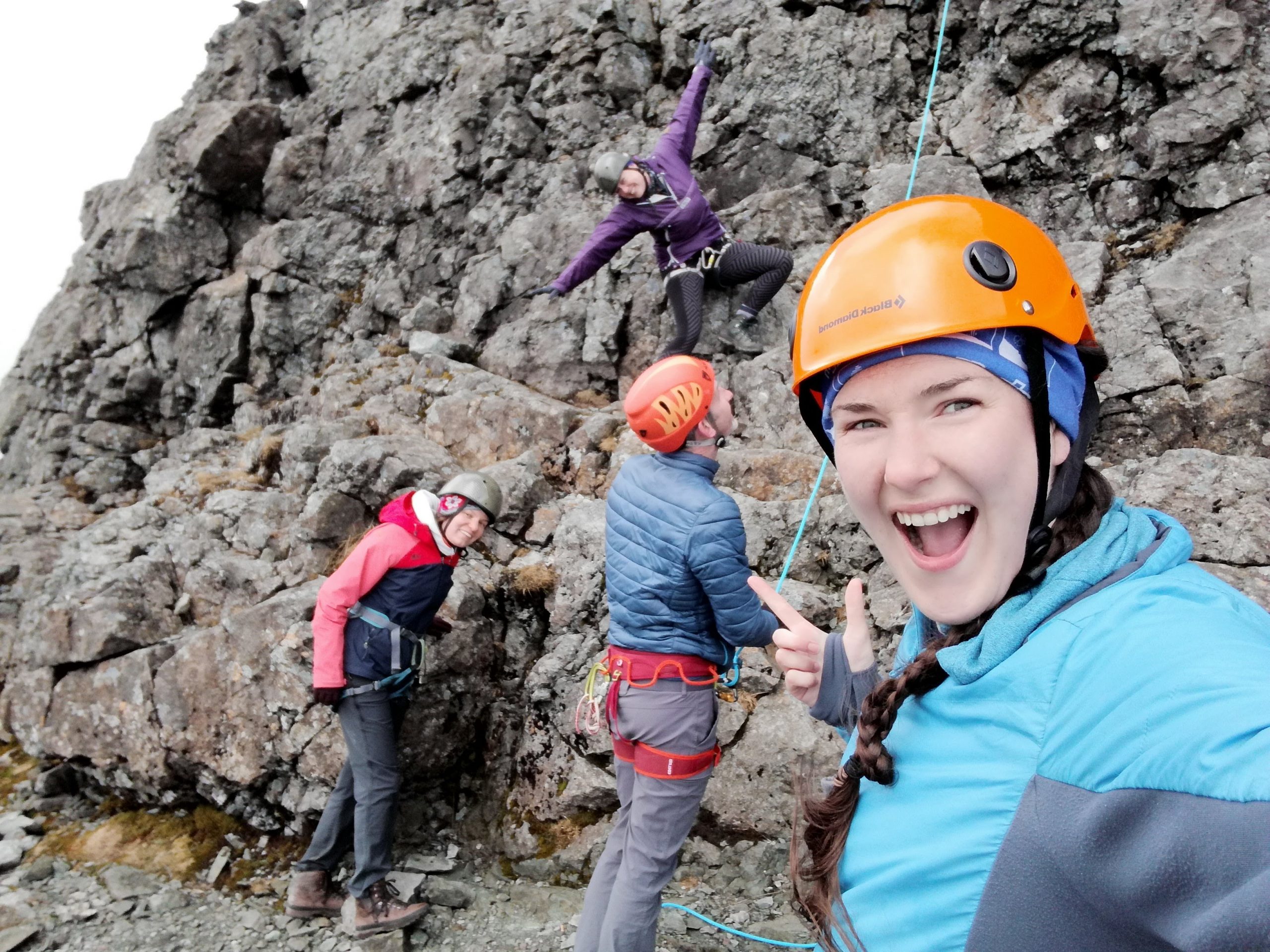 By this time the summit was getting busy. Climbers appeared from all different directions, all hoping to take on the In Pinn, and Jim made the sensible decision to have the rest of us climb up the western side, avoiding the other pesky climbers spoiling our view. This is graded as a VDiff, and we could see why. Bruce and myself (with limited climbing experience) found it particularly challenging, but we made it up and down in one piece, with only the odd “disco leg” and frozen moment of panic. Villo and Tommy scaled it in no time, and all five of us took a brief moment in the sunshine to congratulate ourselves on a climb well done. It was a great group effort, too, as we all shouted encouragement, and guided for footholds from the ground. It was terrifying at the time, but the feeling of accomplishment afterwards was incredible.